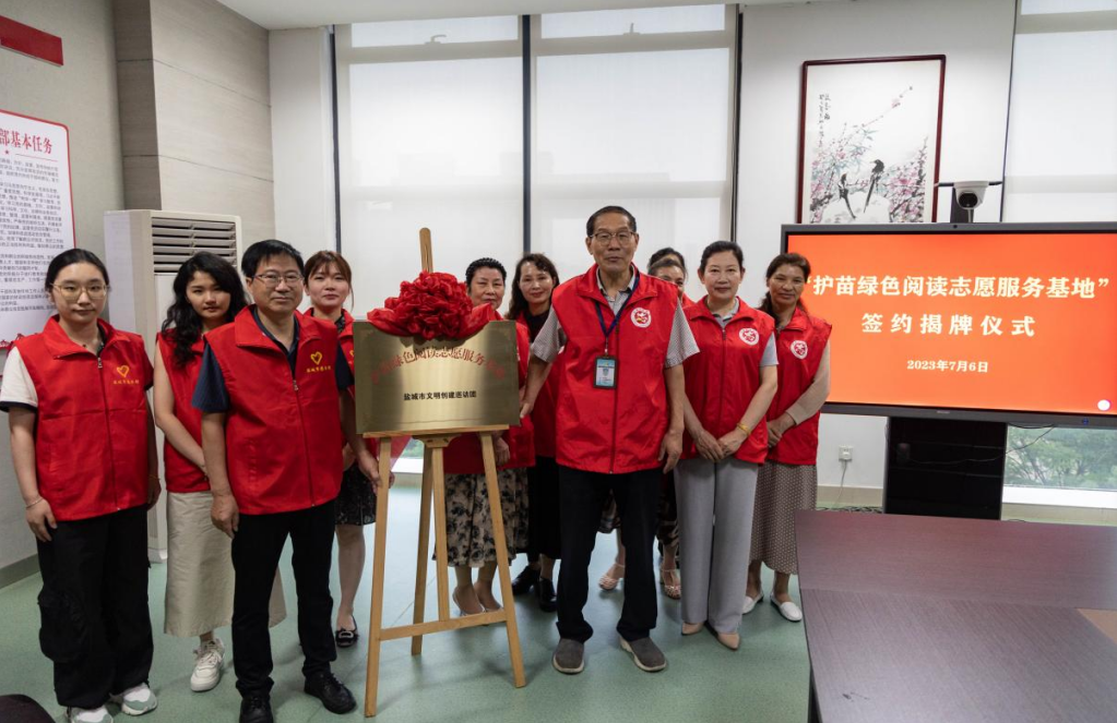 当天下午,文明巡访团、劳模爱心团与图书馆共同签定建立“护苗绿色阅读志愿服务基地”协议暨揭牌仪式。