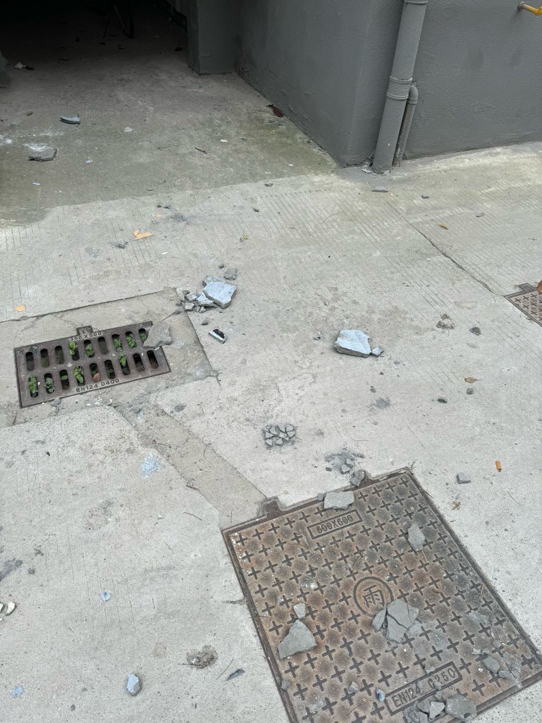小海西路小区楼顶屋檐水泥块脱落无人管 |